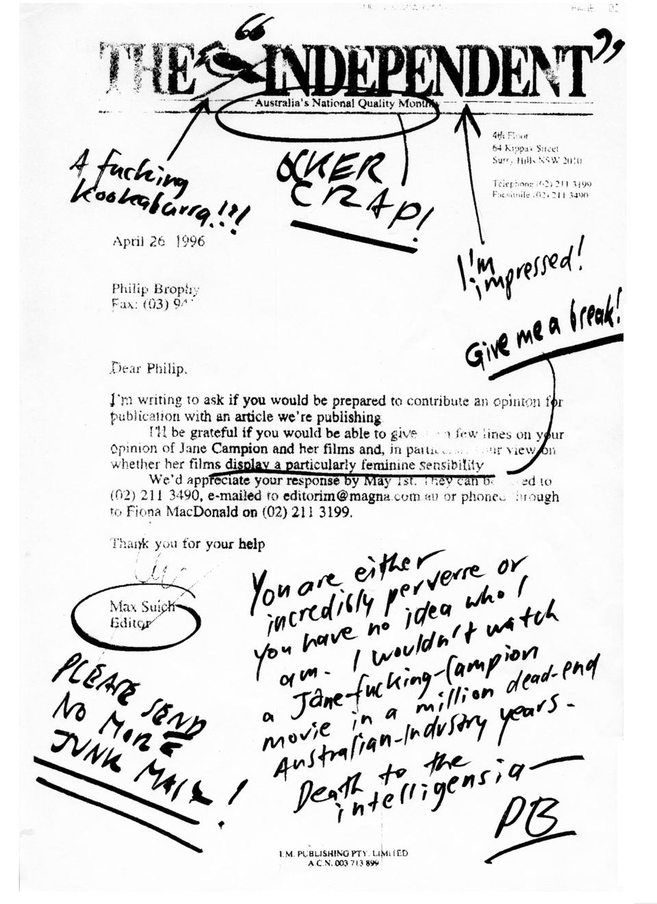Faxed rejection of invitation - The Independent, Sydney, 1996