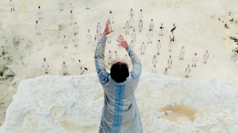 Thus Midsommar’s score becomes a deconstructed psych-folk, turning inside out the melodiousness of Paul Giovanni and Magnet’s song score for Robin Hardy’s definitive folk-horror film The Wicker Man (1971), set in the fictional Summerisle, Scotland. As Midsommar progresses, actor Florence Pugh sounds Dani’s breath, utterances and gasps, dancing across Krlic and Aster’s soundscaping: her anguished screams amplified through a phone speaker atop harsh violin glissandi upon receiving news of her sister’s murder-suicide; her panting nausea over bass synth waves in the plane toilet en route to Stockholm; her accentuated breathing and panic attack slicing violin swarms after ingesting psychedelic mushroom tea at the commune; her urgent objections mixed with a ringing orchestral drone as she witnesses the elderly couple preparing to dive to their death from Hårga’s white rocky plateau. The cult’s congregation often functions as a stage chorus, providing sonorous support by either singing rich cycles and song lines reminiscent of Meredith Monk’s group work, or generating atonal choral hums and foreign tongue murmuring.