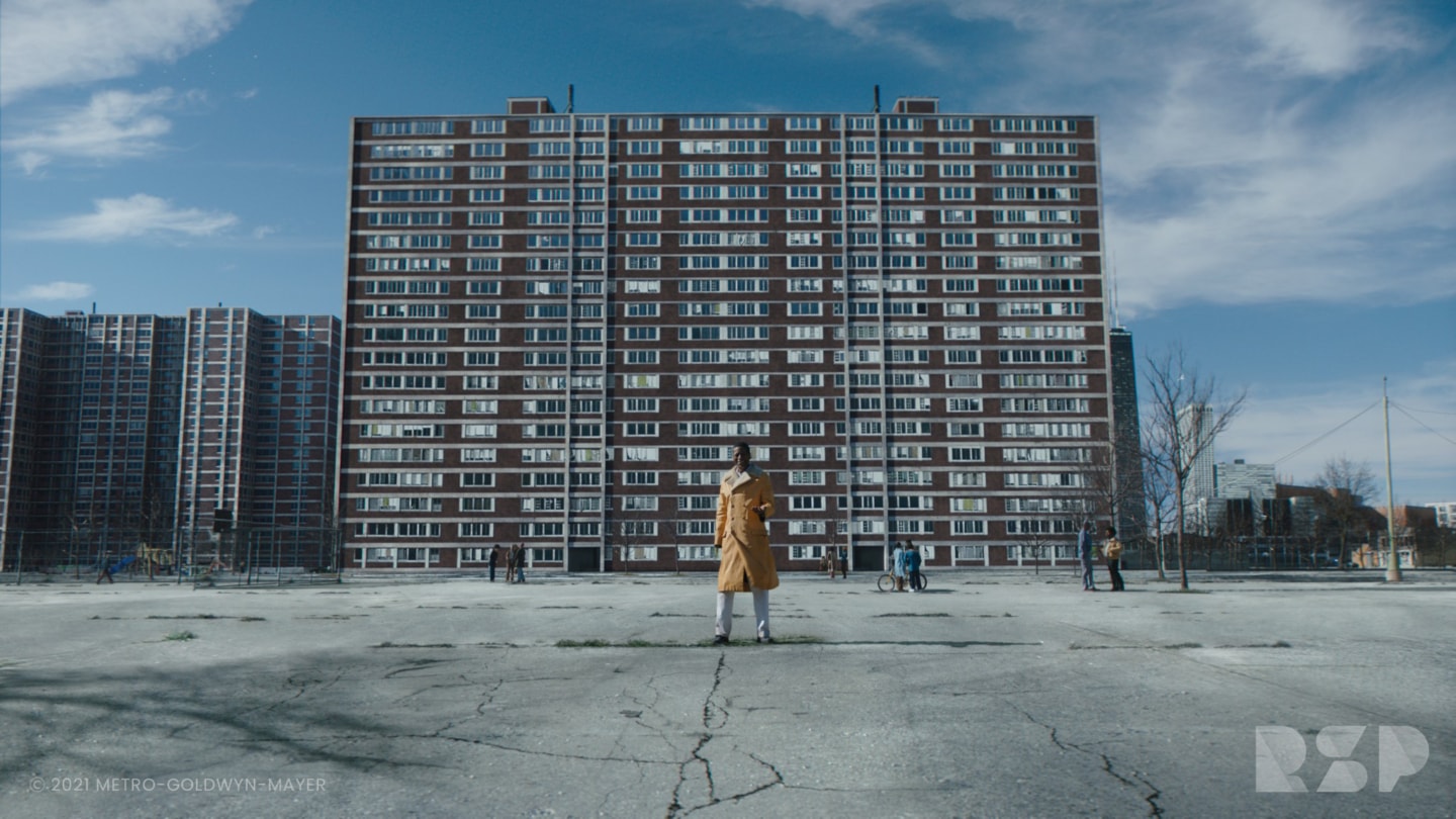 After a prelude set in 1977 where a young boy is attacked by an incarnation of Candyman in the laundry room of the projects, his off-screen scream floats across the grounds, cueing the camera to tilt to the blue sky. In the overhead void, skyscrapers from the present day appear, floating past like levitating sky castles—the result of tracking shots looking up at their fog covered tops as they pass, but with the footage reframed upside-down. Over this title sequence, evidencing the extent of corporate investment and commercial gentrification in contemporary Chicago, Lowe’s most memorable theme “The Sweet” plays. A digital keyboard with a trumpet tone stumbles over itself playing an ostinato with breakages and miscalculations. Wordless falsetto chants swell while deep tones cluster underneath. The piece playfully renders a lo-fi amateur attempt at the Minimalist grandeur Phillip Glass composed for Godfrey Reggio’s Koyaanisqatsi (1982). A memorable scene in that film is a series of helicopter tracking shots over and across the Pruitt-Igoe housing projects in St. Louis, Missouri, which were demolished in 1975. At that historical moment, the modern programme for equitable housing gave way to the commercial programme of economic gentrification—a key theme that DaCosta’s film tackles.